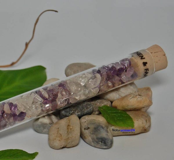 Der Glasstab ist gefüllt mit feinen Edelsteinen, bevorzugt aus fairem Handel und gemmologisch kontrolliert (GKS-Siegel). Ein Reinigen der Steine ist nicht notwendig. Spüle den Stab vor dem ersten Gebrauch gut ab und wiederhole dies von Zeit zu Zeit.