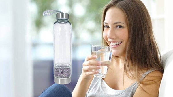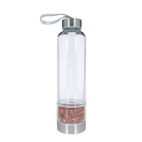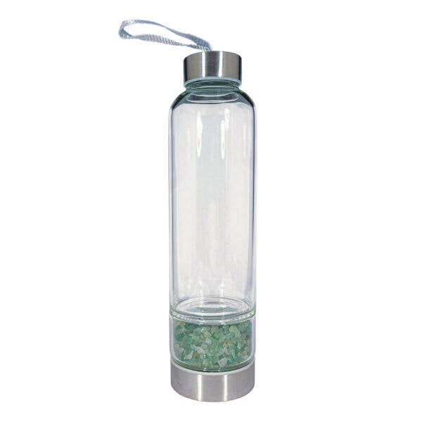 Die Edelsteine selbst kommen nicht mit dem Getränk in Berührung, sondern sind hygienisch geschützt im Glas eingeschlossen. Ein auslaufsicherer Verschluss und die schlanke Form sorgen für komfortables Tragen und zuverlässige Nutzung – perfekt für unterwegs und den täglichen Gebrauch.